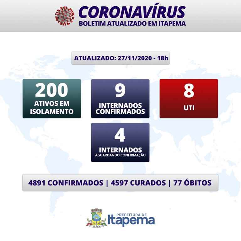 INTERNAÇÕES NO HOSPITAL MUNICIPAL SANTO ANTÔNIO: 9 internados, sendo 8 residentes de Itapema e 1 de Bombinhas (53% ocupado) sendo 6 positivos e 2 aguardando resultado.