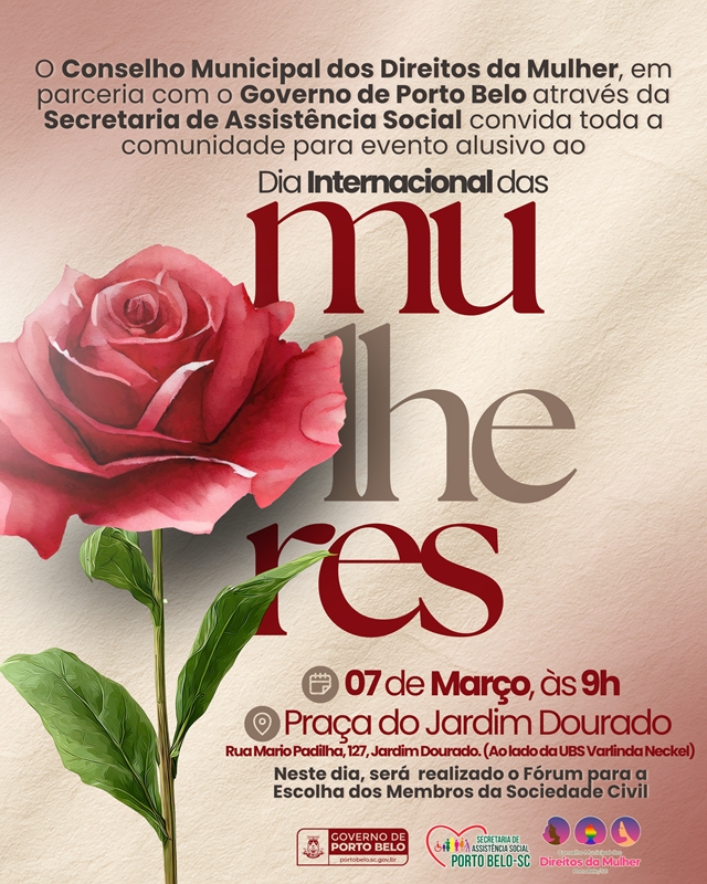 O Conselho Municipal dos Direitos da Mulher, em parceria com o Governo de Porto Belo, através da Secretaria de Assistência Social, irá promover no dia 07 de março, às 9h, na Praça do Jardim Dourado, um importante momento de participação popular: o Fórum para a Escolha dos Membros da Sociedade Civil que irão compor o Conselho Municipal dos Direitos da Mulher.