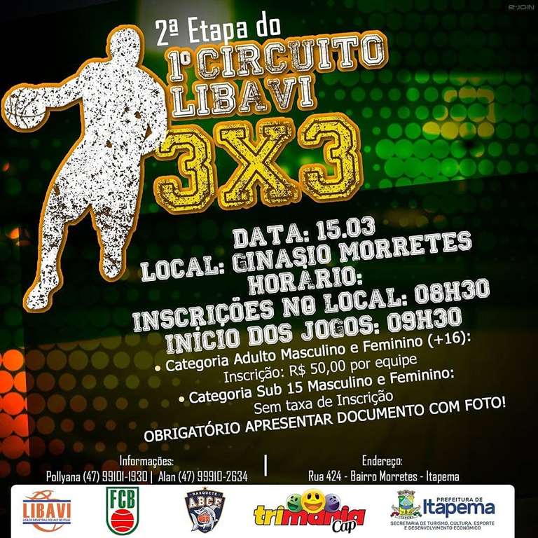 A Prefeitura de Itapema, por meio da Secretaria de Turismo, Cultura, Esporte e Desenvolvimento Econômico, informa que a realização da segunda etapa do do Circuito LIBAVI 3×3 de Basquete prevista para o próximo domingo (15/03) em Itapema foi suspensa. A medida atende a uma decisão da Liga de Basketball do Vale do Itajaí, organizadora do evento, que levou em conta as considerações da Federação Catarinense de Basketball para evitar a realização dos jogos por conta do risco de surto do novo coronavírus.
