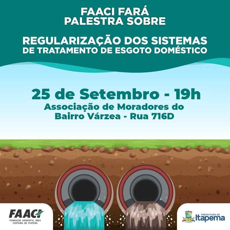 A Fundação Ambiental Área Costeira de Itapema (FAACI) segue com o projeto de orientação à população sobre a necessidade de regularização dos sistemas de tratamento de esgoto doméstico. O próximo encontro será com os moradores do Bairro Várzea na Associação de Moradores localizada na Rua 716D, na quarta-feira (25/09), a partir das 19h.