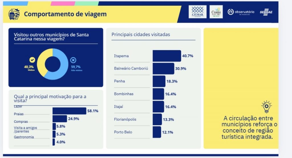 A Pesquisa de Demanda Turística da Região Costa Verde & Mar, apresentada nesta quinta-feira (16), em Itajaí, aponta uma mudança no comportamento dos visitantes: Itapema lidera o ranking de cidades mais visitadas por turistas que percorrem mais de um destino na mesma viagem, com 40,7% das citações. O levantamento, realizado pelo CITMAR em parceria com a AMFRI, Observatório de Turismo e Sebrae, identifica os municípios visitados além do destino principal.