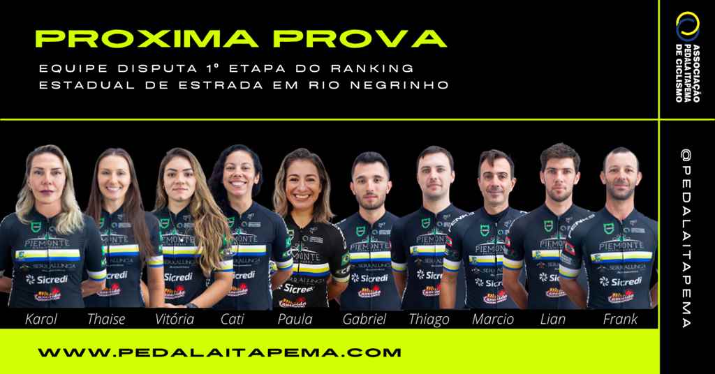 A equipe de ciclismo Pedala Itapema disputa neste fim de semana a 1ª etapa Ranking Estadual de Estrada. A prova será realizada no trecho da SC 112 conhecido como estrada geral da volta grande, em Rio Negrinho. A equipe será representada no masculino por Frank Sinatra Deluvino, Lian Carlos, Marcio João Serpa, Thiago Demarchi e […] Leia mais