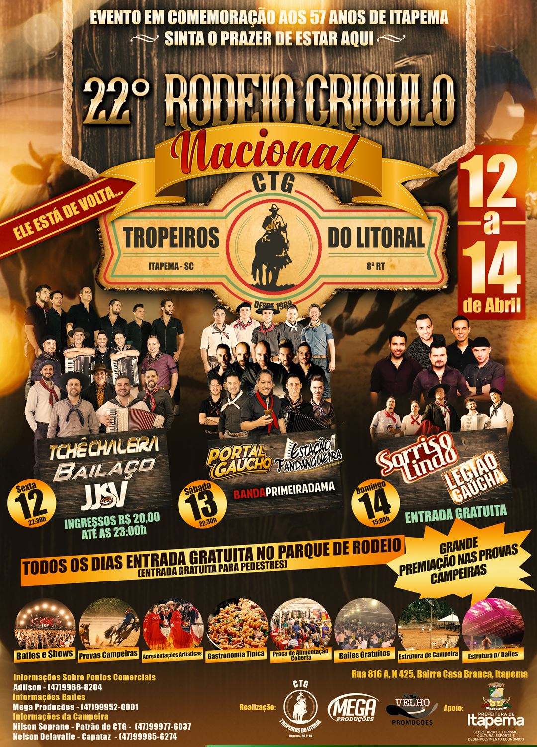 A programação do aniversário de 57 anos de Itapema continua durante todo o mês de Abril. Neste final de semana tem o 22º Rodeio Crioulo Nacional de Itapema. A atividade também marca o retorno da realização deste tipo de evento na cidade na CTG, no Bairro Casa Branca. De sexta-feira (12/04) a domingo (14/04) o […] Leia mais
