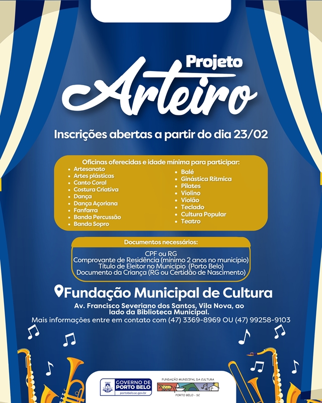 A Fundação Municipal de Cultura de Porto Belo abre, a partir do dia 23 de fevereiro, as inscrições para o Projeto Arteiro, iniciativa que promove o acesso gratuito a oficinas culturais para crianças, jovens, adultos e idosos do município.