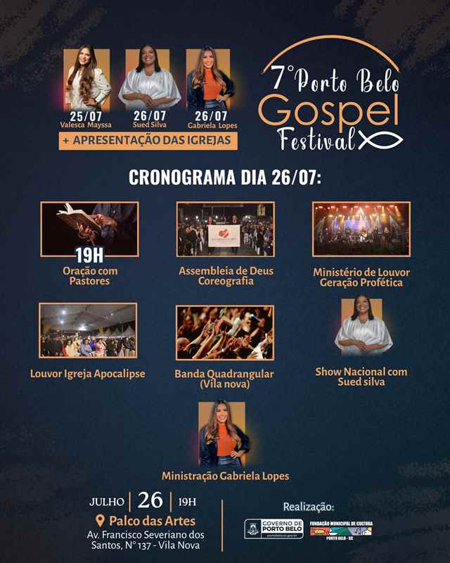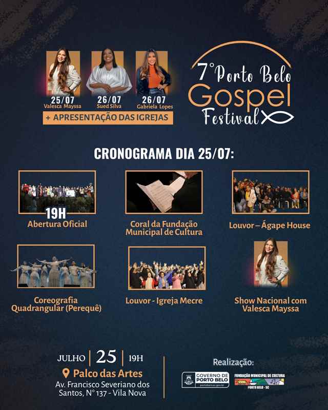 Realizado pelo Governo Municipal de Porto Belo, por meio da Fundação Municipal de Cultura, o Festival Gospel tem como objetivo valorizar a música gospel e fortalecer os laços entre as igrejas evangélicas do município, promovendo um ambiente de comunhão e fé.