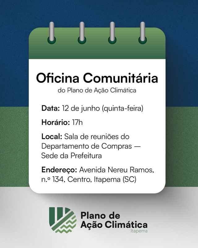 A Prefeitura de Itapema convida toda a população para participar dos primeiros eventos públicos dos Planos Estratégicos do município. No dia 11 de junho (quarta-feira), às 19h, os Planos serão apresentados em Audiência Pública na Câmara Municipal (R. 120, n.º 423, Centro). No dia seguinte (12), às 17, acontecerá a Oficina Comunitária do Plano de Ação Climática na sala de reuniões do Departamento de Compras na Sede da Prefeitura (Av. Nereu Ramos, n.º 134, Centro).