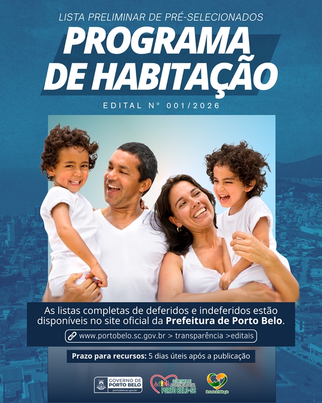 O Governo de Porto Belo, por meio da Secretaria Municipal de Assistência Social e do Conselho Municipal de Habitação, divulgou a lista preliminar de pré-selecionados do Programa de Habitação de Interesse Social, referente ao Edital nº 001/2026.