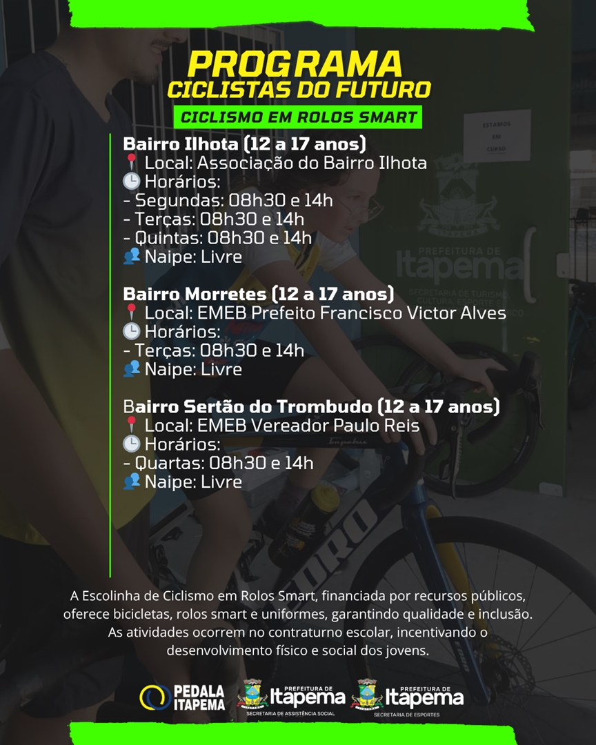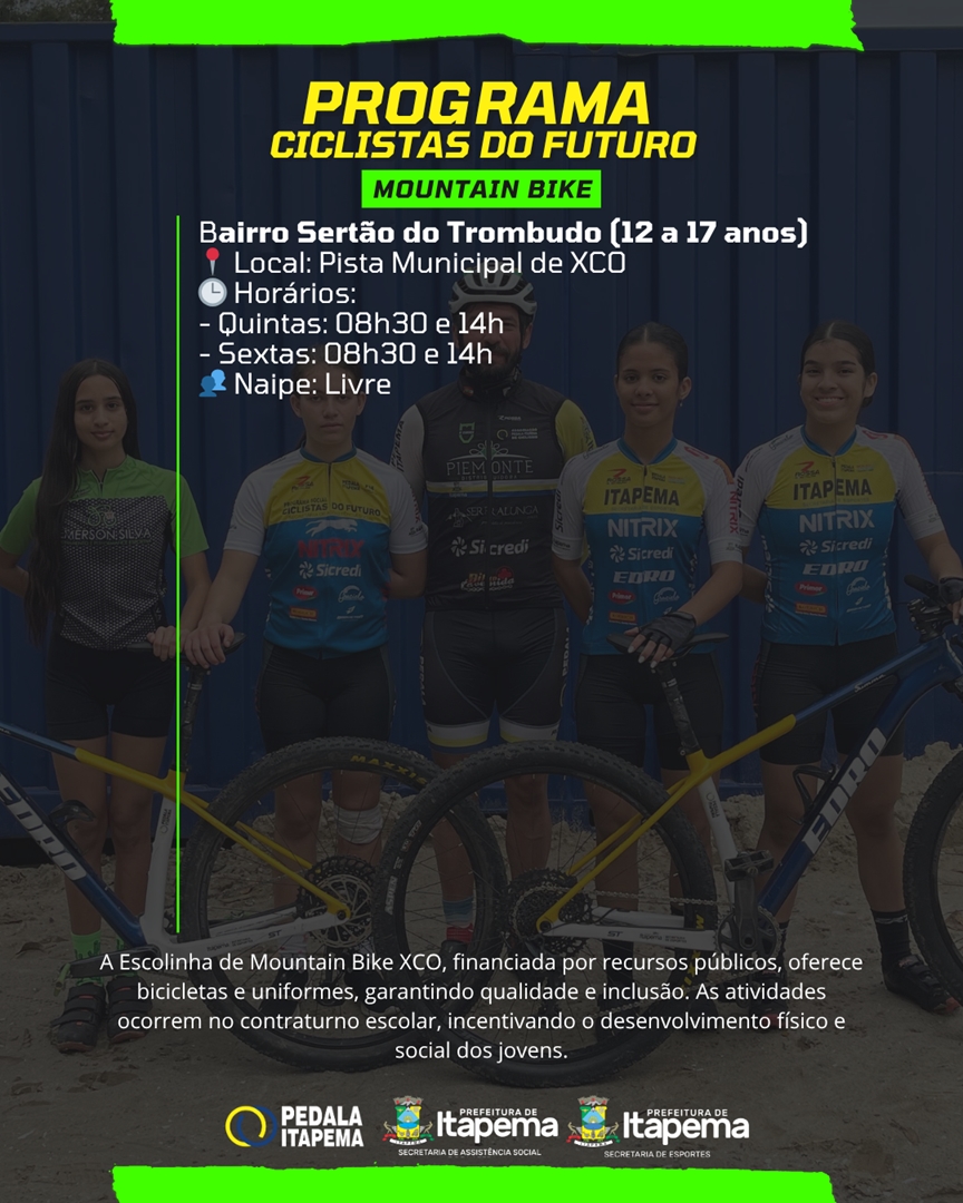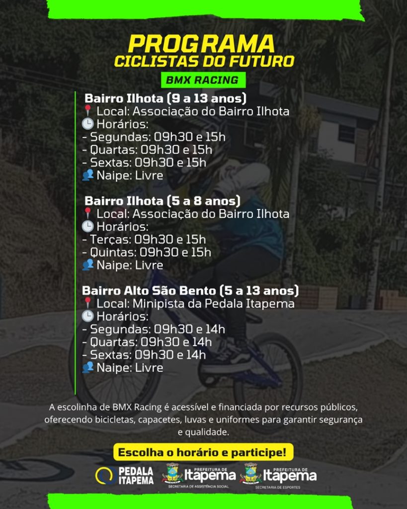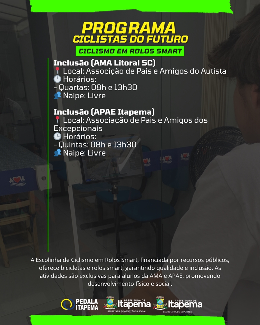O Programa Social Ciclistas do Futuro segue transformando vidas e fortalecendo a prática esportiva em Itapema. Com aulas gratuitas e equipamentos inclusos, o projeto oferece uma oportunidade única para crianças, adolescentes e pessoas com necessidades especiais descobrirem o mundo do ciclismo e do BMX Racing, promovendo saúde, inclusão e ressocialização.