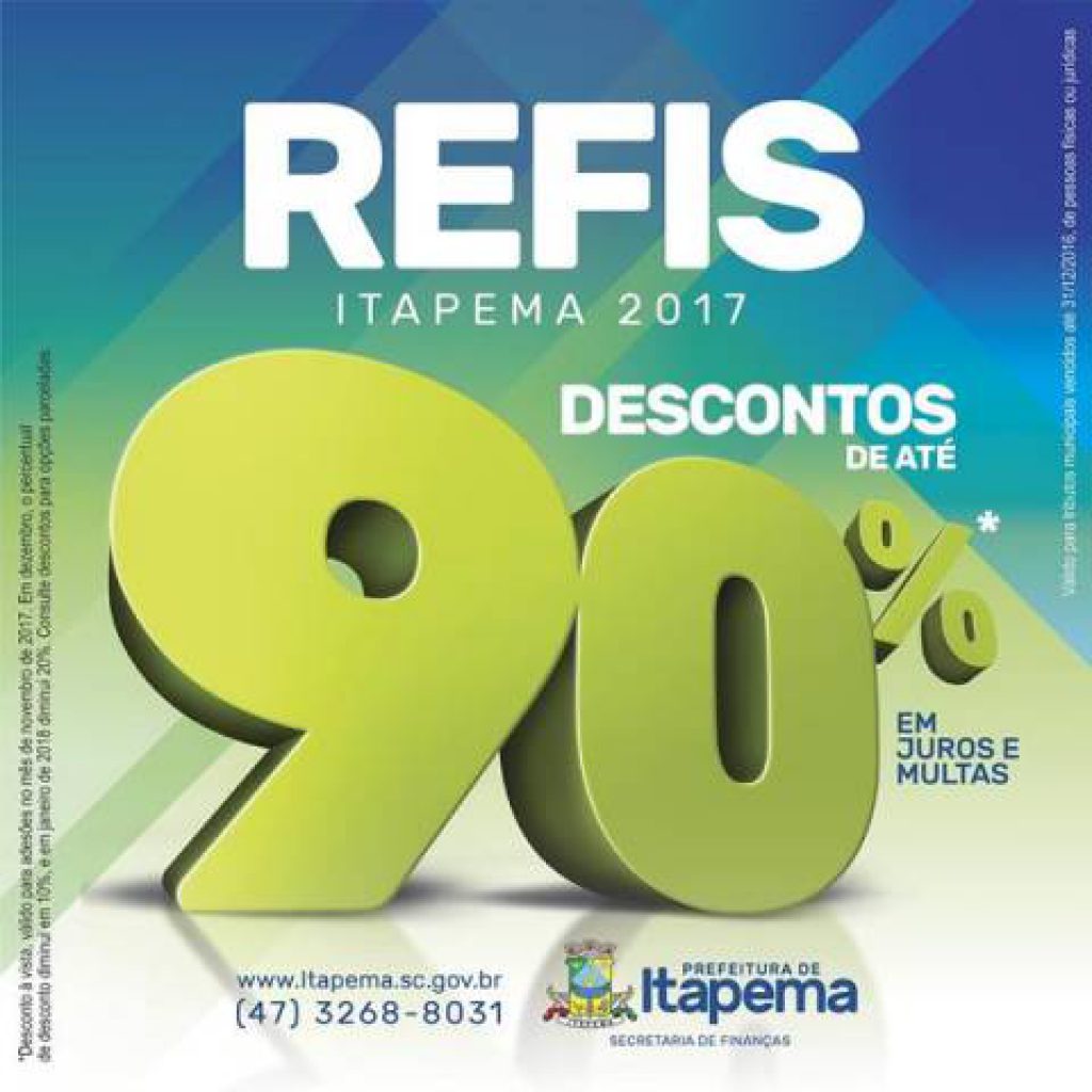 Ainda é possível ficar em dia com o município e receber 90% de desconto nos juro e multas. O de Recuperação Fiscal (Refis) 2017 permite que pessoas físicas ou jurídicas que tenham débitos gerados até 31 de dezembro de 2016 e que farão o pagamento a vista tenham o desconto, se realizaram a quitação da dívida até dia 30/11.
