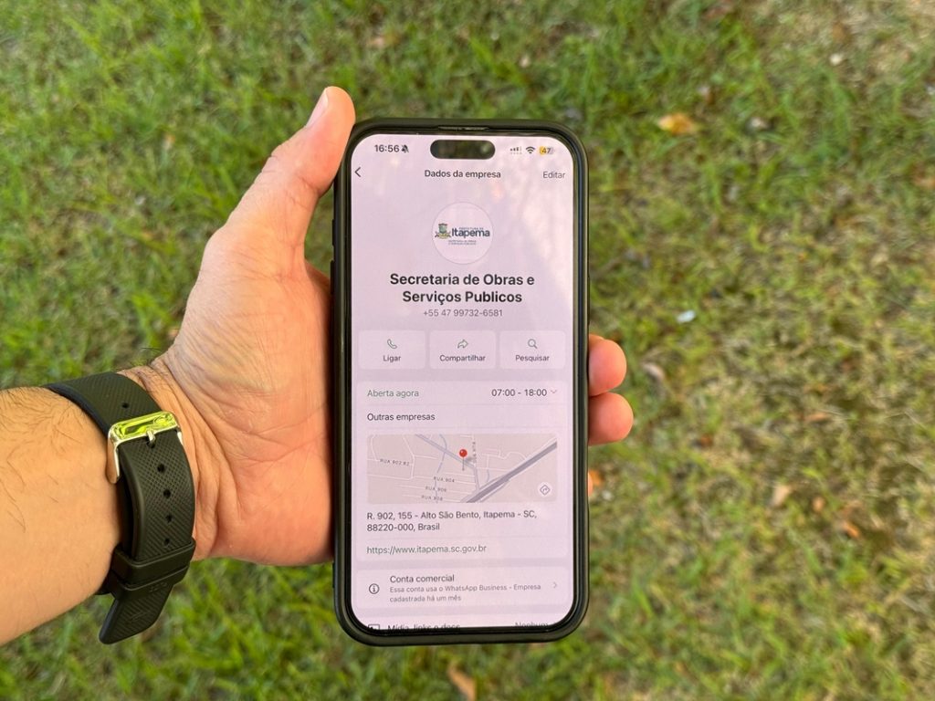 A Secretaria de Obras e Serviços Públicos informa que está com um novo número de WhatsApp para atendimento à população: (47) 9732-6581. O canal é utilizado para esclarecer dúvidas, repassar informações e também para consultas sobre o cronograma do Programa Cata Bagulho. O número antigo (47) 9716-6770 não está mais em funcionamento. A orientação é que a comunidade atualize o contato e utilize exclusivamente o novo número para atendimento direto com a Secretaria.