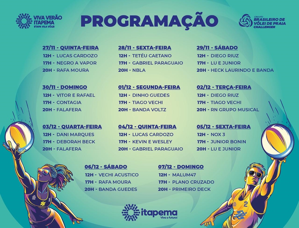 A programação também contará com atrações musicais na Vila do Vôlei, que começam às 12h com Lucas Cardozo, seguem às 17h com Negro a Vapor e encerram às 20h com Rafa Moura, levando ainda mais animação ao início das competições.